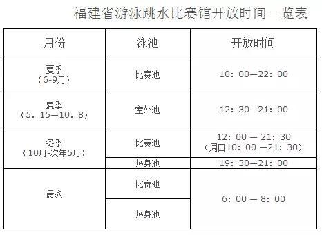 省体育中心游泳跳水馆是目前福建省规模最大、设施最完善、功能最齐全的游泳跳水馆,还配套一个室外游泳池。馆内有10泳道游泳比赛池、热身池、双人跳台跳水比赛池。